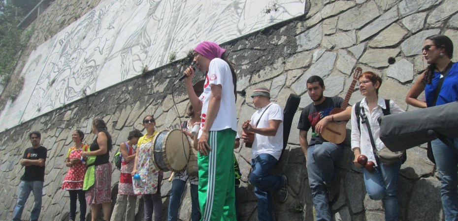 Bajo un cielo parcialmente nublado y una vez desplegada la enorme insignia azul y blanca que abarcaba casi 30 metros cuadrados, comenzó la acción de protesta musical. “Las piloneras”, una agrupación de damas vestidas con coloridos delantales que entonaban tradicionales cantos de pilón, pero con letras adaptadas a la protesta; alzaron sus voces. Fueron acompañadas por varios maraqueros. No podía faltar el cuatro, el instrumento nacional, para amenizar las melodías. El mensaje iba impregnando el ambiente, rompiendo con la rutina de la zona. Durante el desarrollo de la actividad, la comunidad interactuó con los artistas y con los organizadores, haciendo preguntas, compartiendo anécdotas, exponiendo sus quejas, contando sus problemas y hasta confesando estar de acuerdo con la iniciativa, por lo que no faltaron las felicitaciones. El mensaje de unión y los llamados a la defensa de la democracia se hicieron sentir.