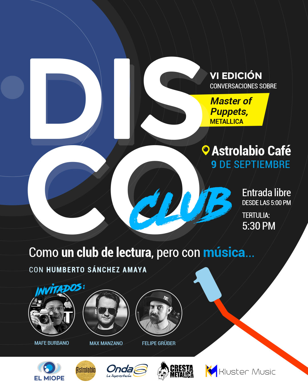 Serán los encargados de analizar, comentar y compartir anécdotas e impresiones sobre esta obra. A partir de este álbum, los panelistas indagarán en el resto de la obra de la banda, una de las referencias del thrash metal, una agrupación que se mantiene vigente, con giras multitudinarias y discos que son motivo de discusión constantemente. El público también podrá participar con sus vivencias y referencias, pues habrá tiempo para preguntas y comentarios en Disco Club. Master of Puppets incluye canciones como “Battery”, “Welcome Home (Sanitarium)”, “Disposable Heroes”, “Orion” y “The Thing That Should Not Be”.