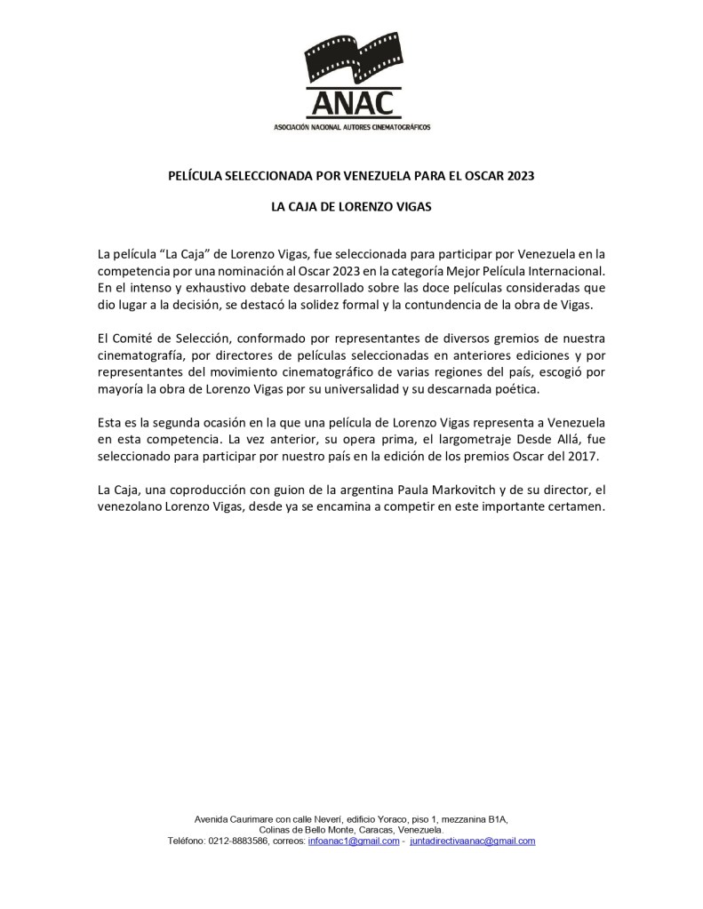 La Asociación Nacional de Autores Cinematográficos anunció que la película La caja, de Lorenzo Vigas, fue seleccionada para participar por Venezuela en la competencia por una nominación al Oscar 2023, en la categoría Mejor Película Internacional.