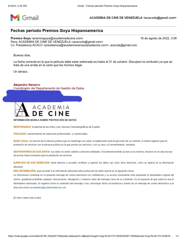 Sin embargo, el ente afirmó que el 16 de agosto recibió otra comunicación de la Academia de Cine de España donde se excusaron por una equivocación en las fechas de estreno de las películas. Explicaron que en realidad las fechas son entre el 1° de agosto del 2021 y el 31 de octubre del 2022, y que era necesario enviar el nombre del nominado antes del 5 de septiembre de 2022.