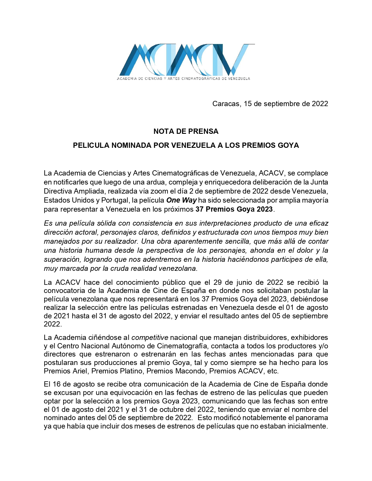 La institución detalló que el 29 de junio de 2022 se recibió la convocatoria de la Academia de Cine de España. Solicitaban postular la película venezolana que representará en la gala del próximo año. En ese momento, señalaron que debían realizar la selección entre las películas estrenadas en Venezuela desde el 1° de agosto de 2021 hasta el 31 de agosto del 2022, y enviar el resultado antes del 5 de septiembre 2022.