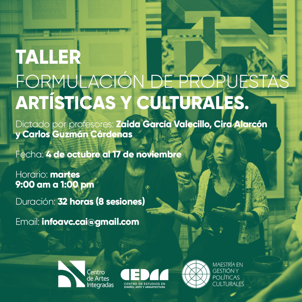 Por un lado, el Centro de Estudios de Diseño, Arte y Arquitectura continúa promoviendo actividades de formación en gestión de bienes culturales mediante el taller Formulación de propuestas artísticas y culturales, el cual será dictado por los profesores Zaida García Valecillo, Cira Alarcón y Carlos Guzmán Cárdenas, desde el 4 de octubre al 17 de noviembre de 2022, los martes de 9:00 am a 1:00pm. Serán ocho sesiones presenciales con una duración total de 32 horas en el Centro de Artes Integradas.