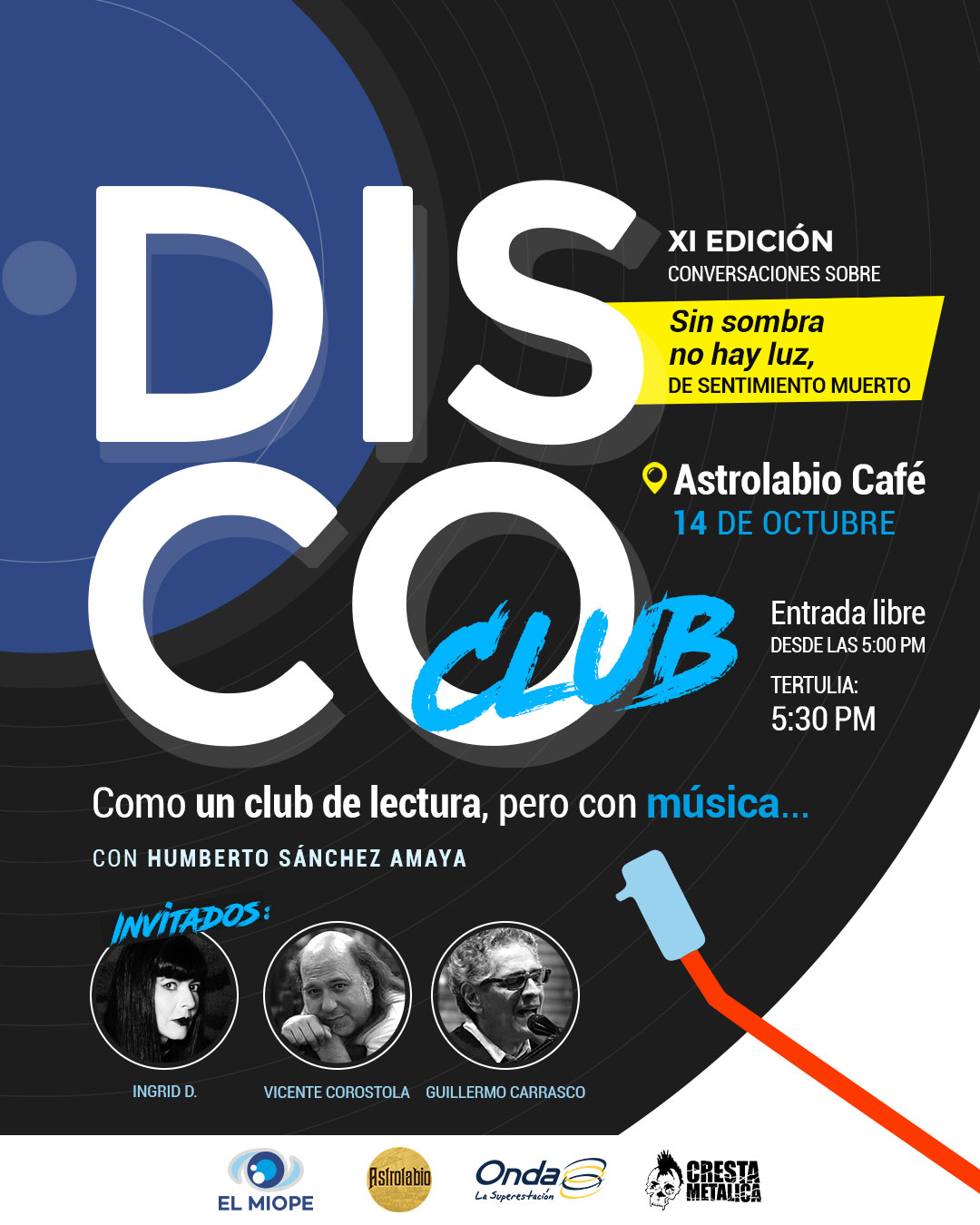 Disco Club es una producción de www.elmiope.com con el apoyo de Onda La Superestación, Cresta Metalica y Mayerlin Perdomo. La cita será en Astrolabio Café, en la avenida Caurimare de Colinas de Bello Monte, Caracas, a pocos metros del Centro Polo.
