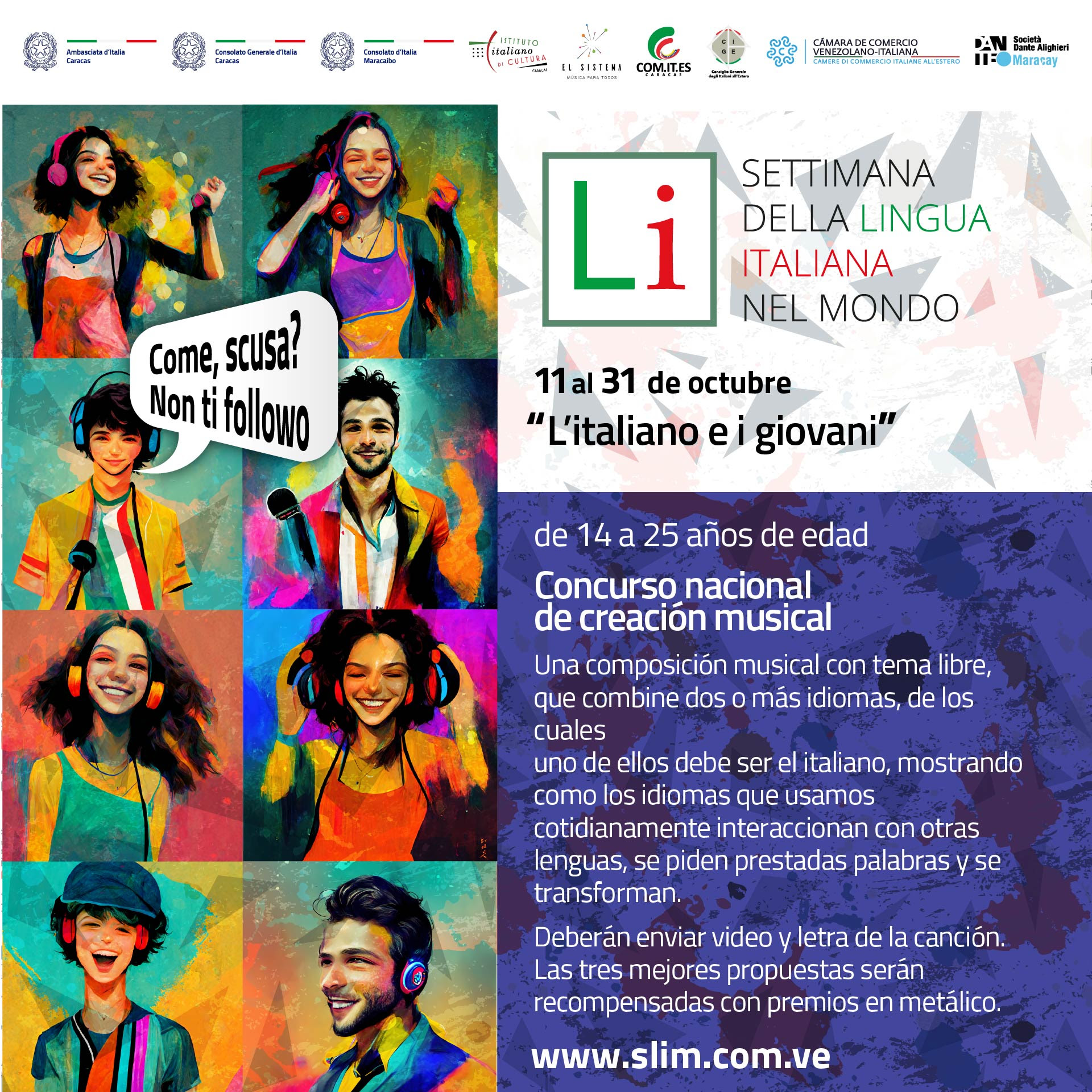 El lema y el público al que se orienta el evento de este año definieron perfectamente la programación cultural, que abrirá un concurso nacional de creación musical y concentrará actividades en cuatro colegios ítalo-venezolanos, donde un representante de cada plantel y un delegado del Instituto Italiano de Cultura de Caracas encabezarán encuentros con los estudiantes donde conversarán sobre la importancia de aprender a hablar italiano. Por su parte, la profesora Elisabetta Balasso ofrecerá a los jóvenes una clase-taller titulada Followare en itañol, que busca reconocer cómo el italiano que hablamos en casa y las formas en que hablan los jóvenes están llenas de palabras prestadas e innovaciones que crean un idioma nuevo y diferente.