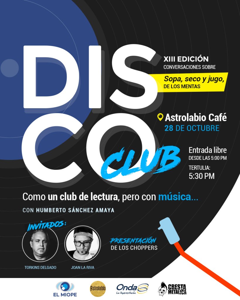 Con canciones como “El kiosco”, “Johnny Ramone”, “Prueba De Sonido”, “Burundanga” y “Sin amigos”, Sopa, seco y jugo se convirtió en una obra clave de una agrupación que se ha caracterizado por su humor, atinada observación urbana, además de una revisión de cierto ideario del país, de la movida musical y de referentes culturales. Esa noche Disco Club cerrará con la presentación de Los Choppers. Desde temprano habrá venta de vinilos.
