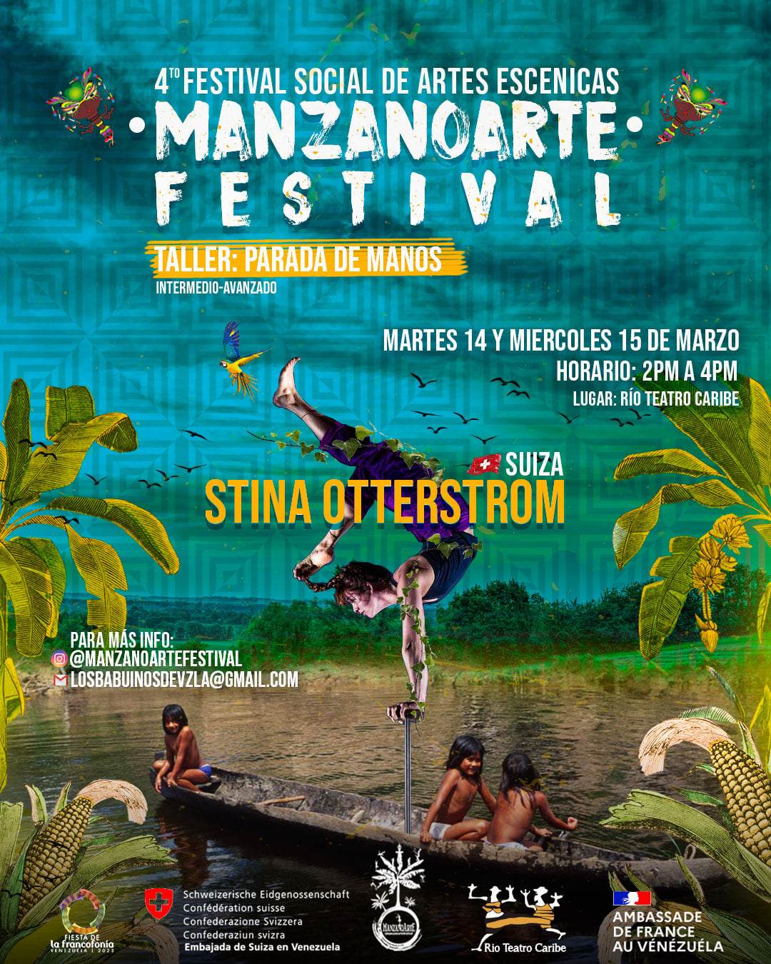Unos 20 artistas venezolanos de circo, artes escénicas, danza y hip hop serán los representantes locales en el festival: Luis Bogado (aka El Enano) y Zorybel García, fundadores de Fundación Manzanoarte, formados en la Academia de Teatro Dimitri en Suiza; Jesús Orta, el bailarín y coreógrafo creador de la compañía de danza urbana D´La Funky; Marilú García, acróbata aérea y bailarina de danza contemporánea; Jhoanbeat, músico y artista de beatbox; así como el ilusionista Bismarck.