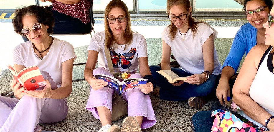 Melissa Nahmens y María Alejandra Bello del proyecto Qué Leer y Elena García de la agencia Comunica & Conecta, acompañadas por Luis Sequera de Fundación La Poeteca fueron recibiendo a todos quienes se fueron acercando al punto de encuentro. Dos bibliotecas llenas de libros de muchos autores, muchos géneros y formatos que se iban entregando al azar acompañados por una bonita rosa, e invitarles a pasar al espacio destinado para tomarse un cafecito o quedarse para las actividades que pronto comenzaban.